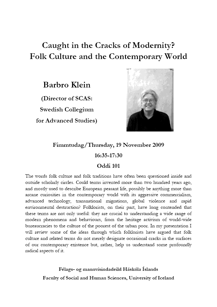 [Gandur] Í dag: Barbro Klein: Caught in the Cracks of Modernity? Folk Culture and the Contemporary World kl. 16.35 í Odda 101. Allir velkomnir