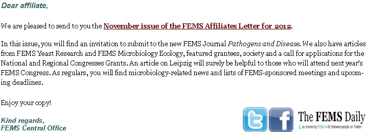 FEMS Affiliates Letter for 2012. In this issue, you will find an invitation