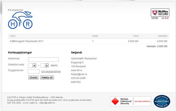 Síðan er smelt á áfram og þá eru þið flutt yfir á örugga síðu hjá Valitor á