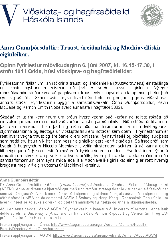 [Vid-stund] Traust, áreiðanleiki og Machiavellískir eiginleikar: Anna Gunnþórsdóttir, dósent við Australian Graduate School of Management er með fyrirlestur á vegum viðskipta- og hagfræðideildar Háskóla Íslands á morgun, miðvikudag, kl. 16.15, í Odda stofu 101. ALLIR VELKOMNIR.
