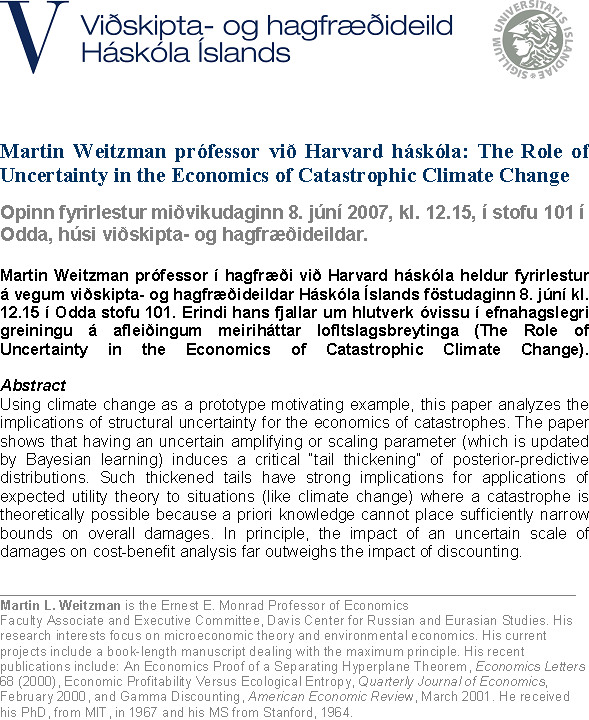 [Vid-stund] The role of Uncertainty in the Economics of Catastrophic Climate Change: Fyrirlestur með Martin Weitzman prófessor í hagfræði við Harvard háskóla á vegum viðskipta- og hagfræðideildar Háskóla Íslands föstudaginn 8. júní kl. 12.15 í Odda stofu 101. ALLIR VELKOMNIR.