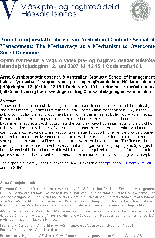 [Vid-stund] Anna Gunnþórsdóttir dósent við Australian Graduate School of Management: The Meritocracy as a Mechanism to Overcome Social Dilemmas. Opinn fyrirlestur á vegum viðskipta- og hagfræðideildar Háskóla Íslands þriðjudaginn 12. júní 2007, kl. 12.15, í Odda stofu 101. Allir velkomnir.