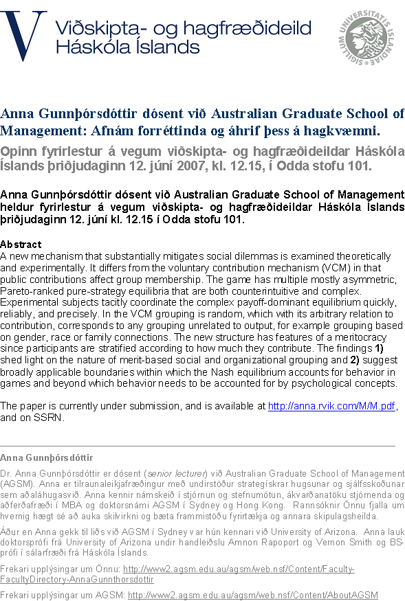 [Vid-stund] Afnám forréttinda og áhrif þess á hagkvæmni: Anna Gunnþórsdóttir heldur fyrirlestur á vegum viðskipta- og hagfræðideildar í dag, þriðjudag, kl. 12.15 í Odda stofu 101. Allir velkomnir.
