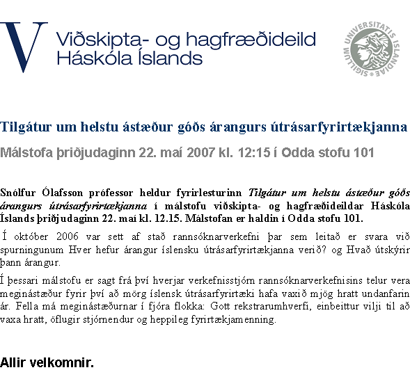 [Vid-stund] Tilgátur um helstu ástæður góðs árangurs útrásarfyrirtækjanna: Málstofa viðskipta- og hagfræðídeildar Háskóla Íslands þriðjudaginn 22. maí kl. 12.15 í Odda stofu 101. Allir velkomnir.