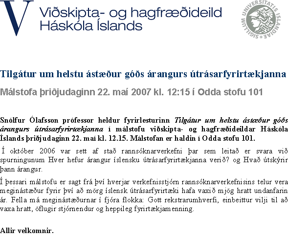 [Vid-stund] Tilgátur um helstu ástæður góðs árangurs útrásarfyrirtækjanna: Málstofa í dag kl. 12.15 í Odda stofu 101. Allir velkomnir.