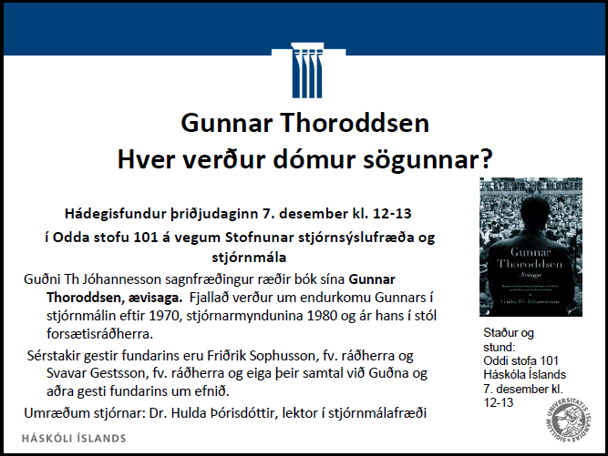 [Vid-stund] Á MORGUN: Hádegisfundur 7. des kl. 12 "Gunnar Thoroddsen. Hver verður dómur sögunnar?" í stofu 101 Odda