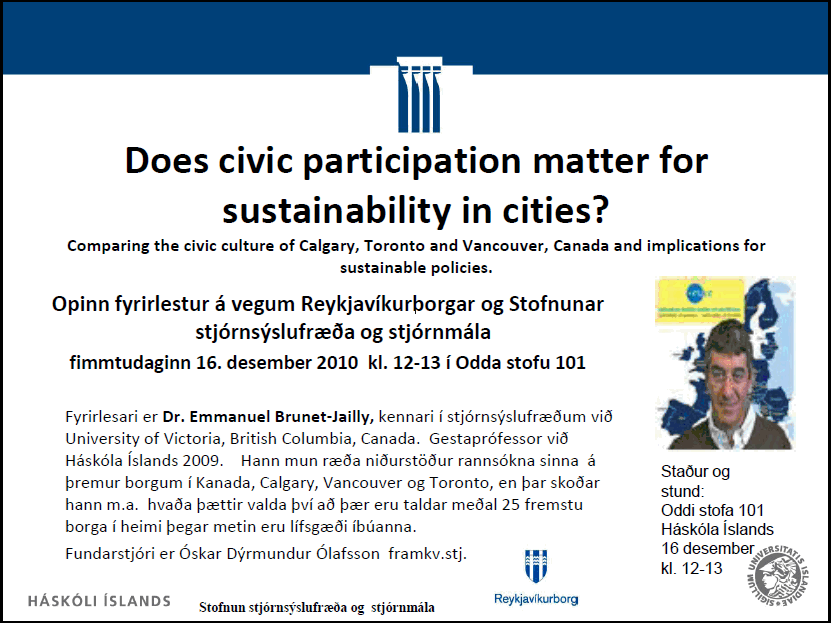 [Vid-stund] Á MORGUN: Til áhugafólks um Íbúalýðræði, bætt lífsgæði íbúa og sjálfbærni borga: Opinber fyrirlestur "Skiptir þátttaka almennings máli fyrir sjálfbærni borgarsamfélaga? 16. des kl. 12-13 í Odda st. 101