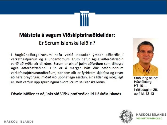 [Vid-stund] Málstofa í Viðskiptafræðideild: Er Scrum íslenska leiðin? Eðvald Möller á Háskólatorgi, HT-101 kl. 12-13. Þriðjudaginn 26. apríl