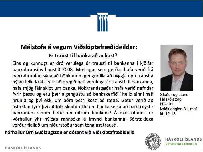 [Vid-stund] Málstofa á vegum Viðskiptafræðideildar: Er traust til banka að aukast? Þórhallur Örn Guðlaugsson á Háskólatorgi, HT-101, þriðjudaginn 31. maí kl. 12-13