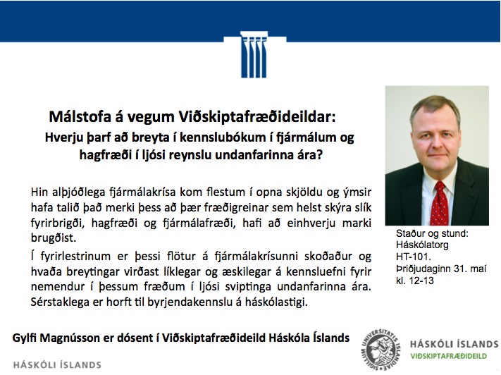 [Vid-stund] Í DAG: Málstofa á vegum Viðskiptafræðideildar: Hverju þarf að breyta í kennslubókum í fjármálum og hagfræði í ljósi reynslu undanfarinna ára? Gylfi Magnússon á Háskólatorgi, HT-101. Þriðjudaginn 31. maí kl. 12-13