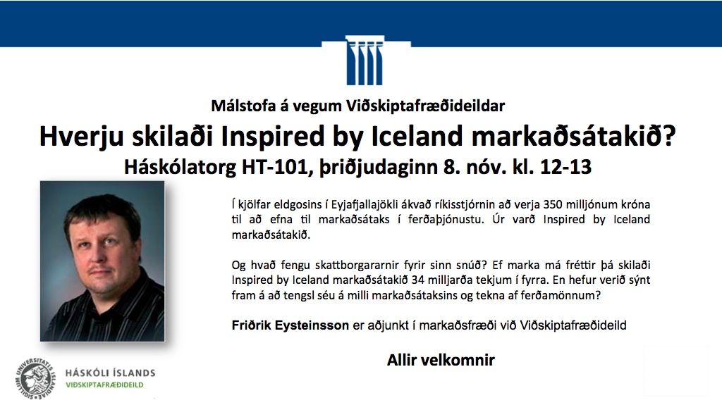 [Vid-stund] Hverju skilaði Inspired by Iceland markaðsátakið? Friðrik Eysteinsson á Háskólatorgi HT-101, þriðjudaginn 8. nóv. kl. 12-13