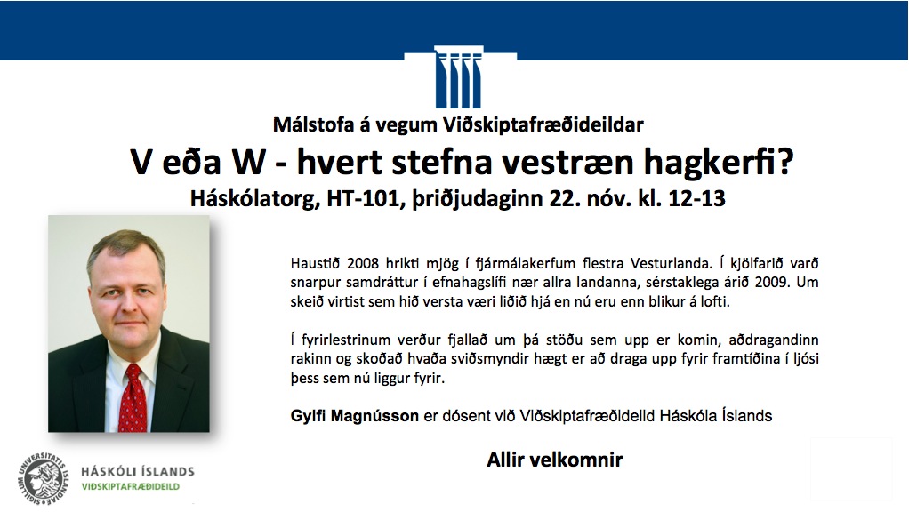 [Vid-stund] V eða W - hvert stefna vestræn hagkerfi? Gylfi Magnússon á Háskólatorgi, HT-101, þriðjudaginn 22. nóv. kl. 12-13
