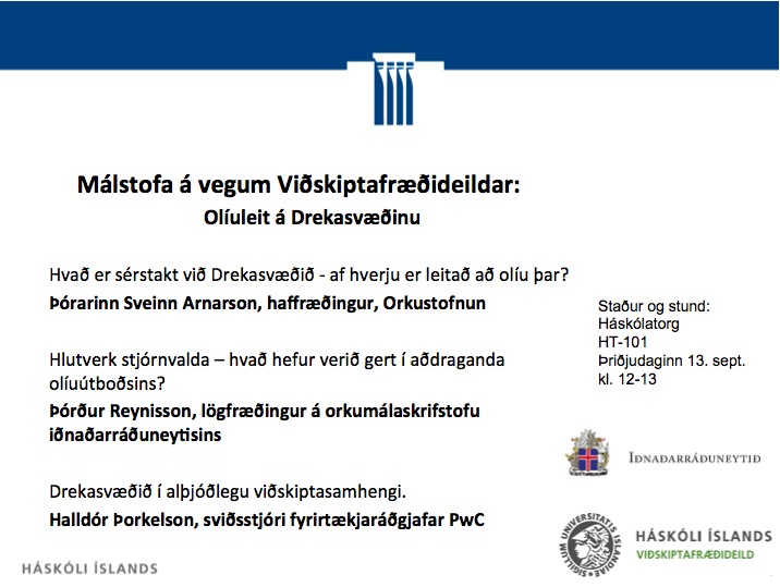 [Vid-stund] Málstofa í Viðskiptafræðideild: Olíuleit á Drekasvæðinu á Háskólatorgi, HT-101, þriðjudaginn 13. sept kl. 12-13