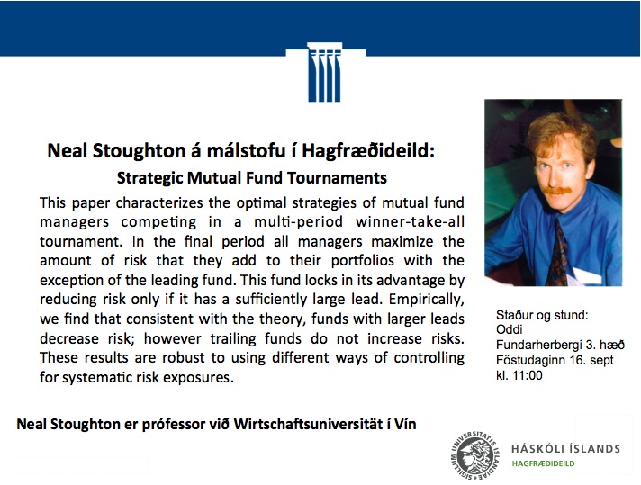[Vid-stund] "Strategic Mutual Fund Tournaments" Neal Stoughton á málstofu í Hagfræðideild föstudaginn 16. september kl. 11:00