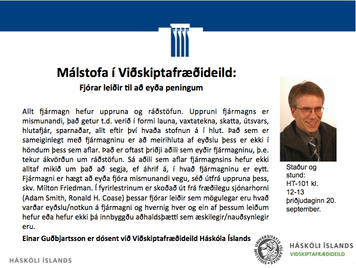 [Vid-stund] "Fjórar leiðir til að eyða peningum" Einar Guðbjartsson á Háskólatorgi, HT-101, þriðjudaginn 20. sept kl. 12-13