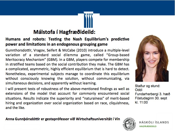 [Vid-stund] Málstofa í Hagfræðideild: Humans and robots: Testing the Nash Equilibrium's predictive power and limitations in an endogenous grouping game, föstudaginn 30. sept kl. 11:00