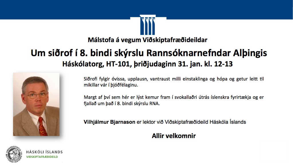 [Vid-stund] Á MORGUN: Um siðrof í 8. bindi skýrslu Rannsóknarnefndar Alþingis - þriðjudaginn 31. janúar kl. 12-13 í HT-101