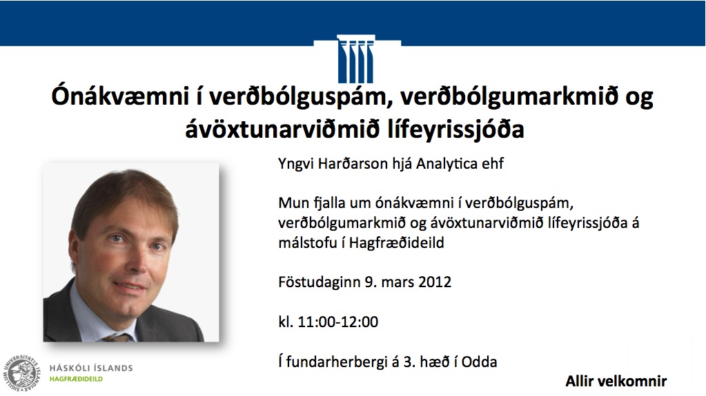 [Vid-stund] Ónákvæmni í verðbólguspám, verðbólgumarkmið og ávöxtunarviðmið lífeyrissjóða - föstudaginn 9. mars kl. 11 í fundarherbergi á 3. hæð í Odda.