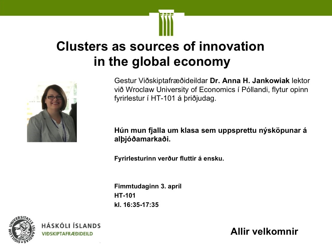 [Vid-stund] Opinn fyrirlestur á eftir kl. 16:35: Clusters as sources of innovation in the global economy