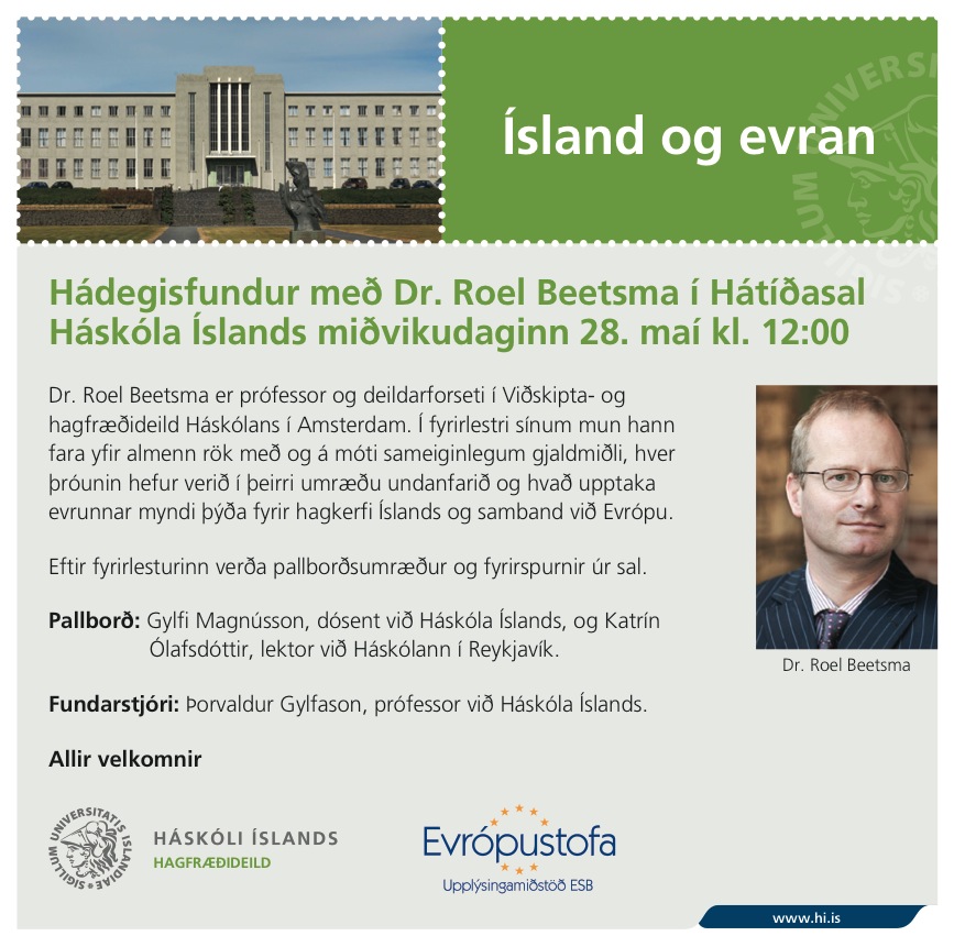[Vid-stund] Ísland og evran - hádegisfundur með dr. Roel Beetsma miðvikudaginn 28. maí