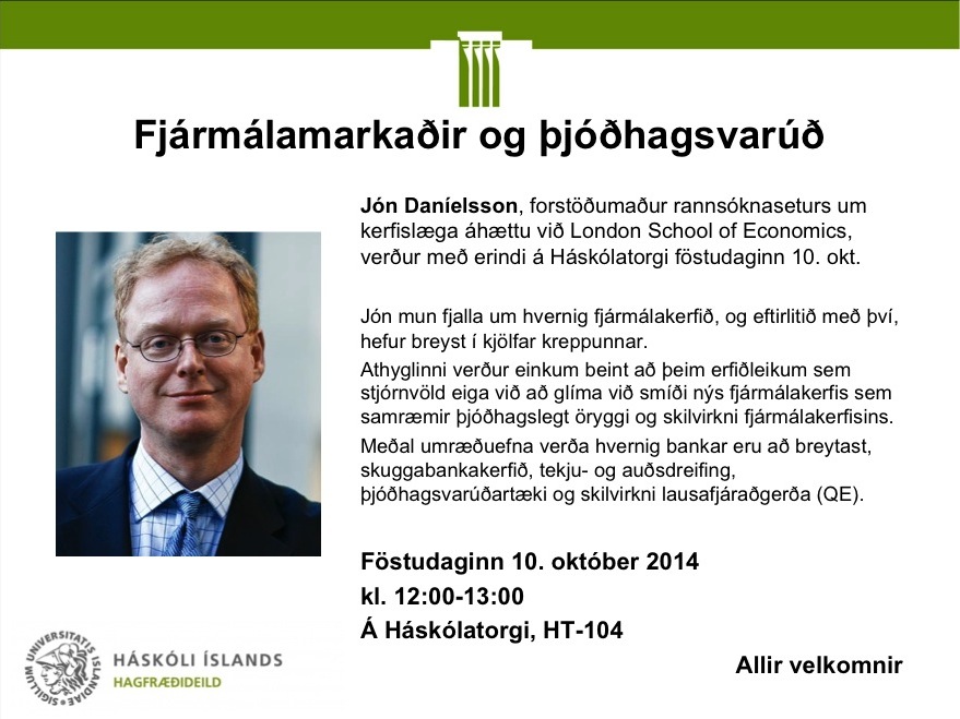 [Vid-stund] Fjármálamarkaðir og þjóðhagsvarúð, fyrirlestur Jóns Daníelssonar 10. okt.