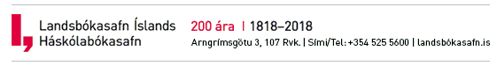 Fyrirvari / Disclaimer<http://fyrirvari.landsbokasafn.is/> | Leiddu hugann að umhverfinu áður en þú prentar út [cid:tree_c14bcf3c-c37b-4c43-bf41-0f7a76548775.png] | [cid:fb_e671d796-2724-434e-bbe5-d0b1061d706c.png] <https://www.facebook.com/Landsb%C3%B3kasafn-%C3%8Dslands-H%C3%A1sk%C3%B3lab%C3%B3kasafn-49834298059> [cid:tw_be2becce-96c1-4a01-a13d-14487c25aec6.png] <https://twitter.com/Landsbokasafn> [cid:yt_00448cc9-19ed-4462-892c-a5e26244c6fd.png] <https://www.youtube.com/channel/UCl3SsrPtMBkSdKirHno9DkQ> [cid:inst_c09ee869-260e-4a99-8f85-a4b6d2dfed84.png] <https://www.instagram.com/landsbokasafn>
